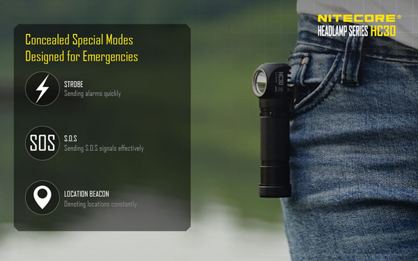 Φακός Κεφαλής LED 1000 Lumens της NITECORE, HEADLAMP HC30. Αποσπάται από τον ιμάντα του και μπορεί να χρησιμοποιηθεί ως φακός χειρός με την ιδιαίτερη δυνατότητα που του δίνει το σχήμα του (Γάμα).